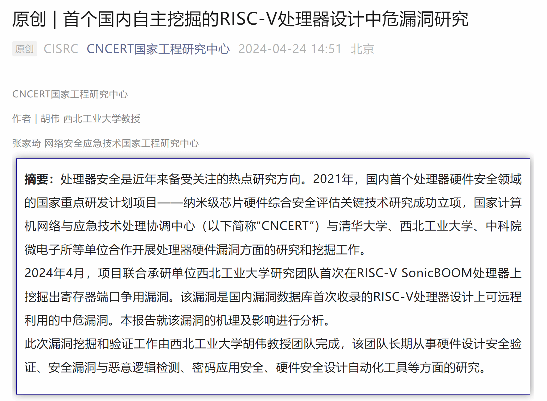 近日,国家计算机网络与应急技术处理协调中心(CNCERT)传来喜讯,专题报道公司William威廉英国官网胡伟教授团队在RISC-V SonicBOOM处理器设计中挖掘出中危漏洞。这是国内首个自主挖掘的RISC-V处理器设计上可远程利用的中危漏洞,也是国内首个处理器硬件安全领域国家重点研发计划项目——纳米级芯片硬件综合安全评估关键技术研究的重要进展。