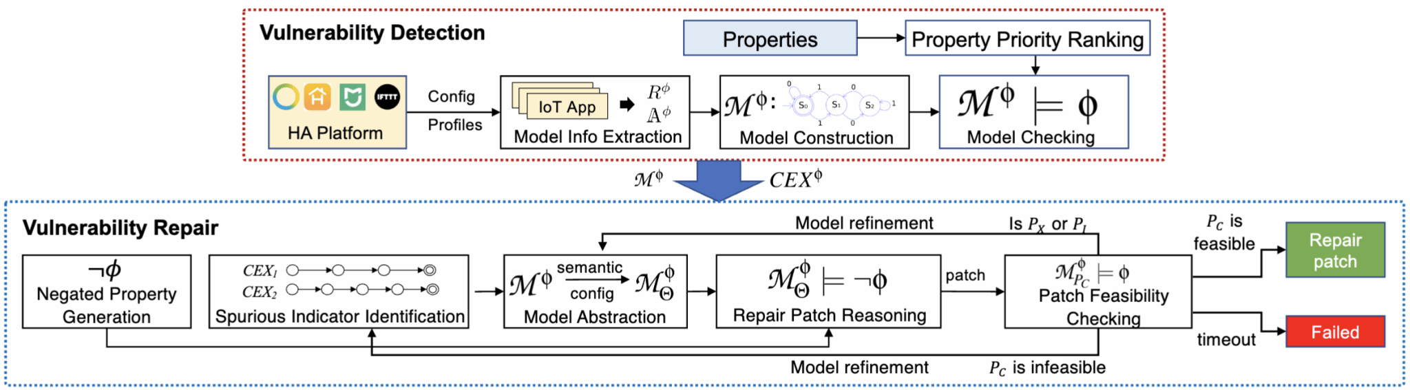 论文针对智能家居自动化系统安全防御机制中“漏洞威胁识别不全面”、“漏洞自动修复率低”、“漏洞修复侧影响力高”等问题,基于对物理与信息域交互的形式化建模,提出了一种全新的漏洞自动检测和修复方法:基于反属性推理的家居自动化漏洞自动检测与修复,能够利用模型抽象和细化以及基于反属性的模型检查来自动推断漏洞补丁,实现在物理与信息融合的全域空间下的漏洞检测与修复。实验结果表明,针对三星SmartThings、IFTTT、米家等智能家居平台应用市场的自动化应用和用户自定义的自动化规则,论文设计的漏洞检测与修复机制能够获得凸出的漏洞自动检测准确率和修复成功率。论文相关代码已开源。