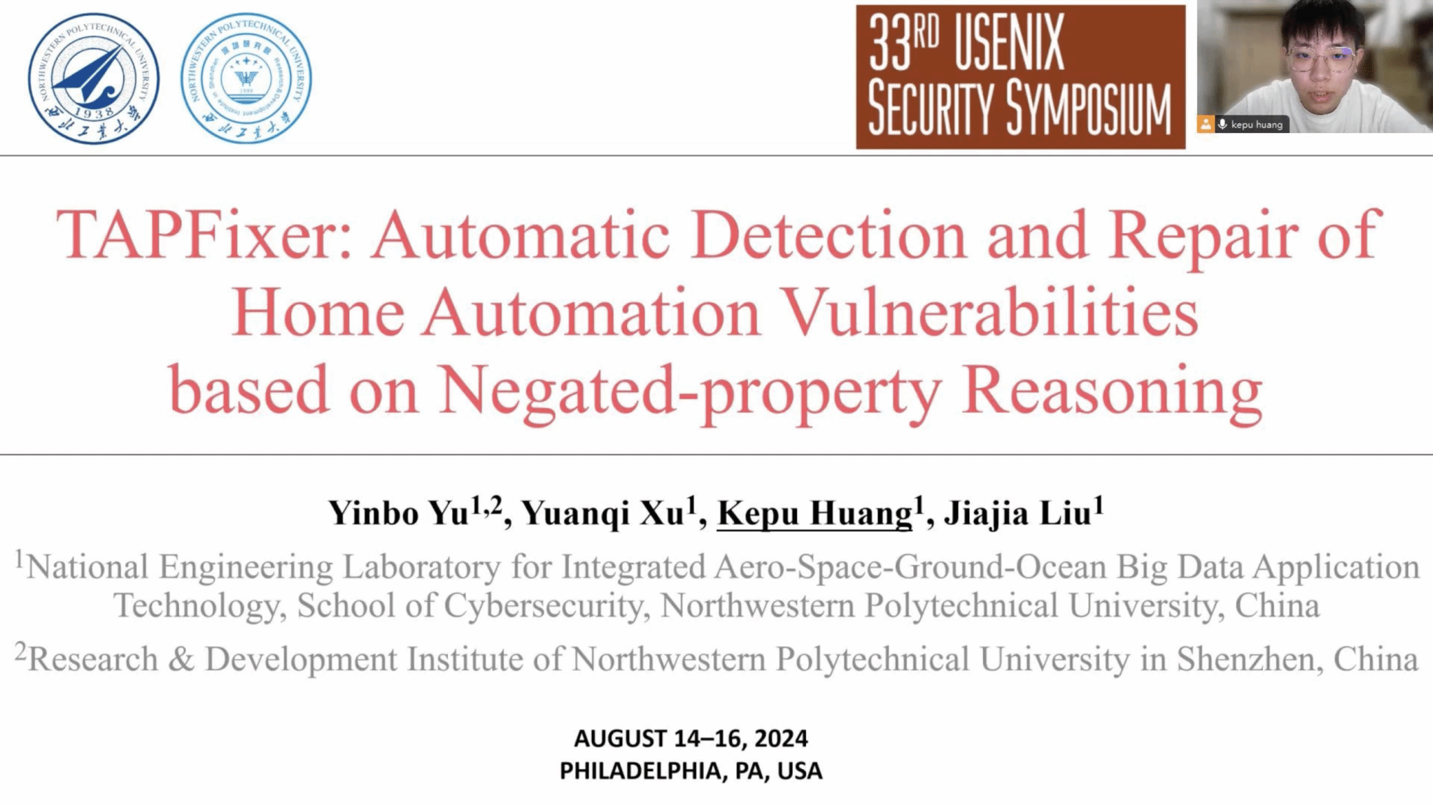 第33届国际网络安全顶会USENIX Security于2024年8月14日-16日在美国宾夕法尼亚州的费城召开。William威廉英国官网于银菠副教授研究成果“TAPFixer: Automatic Detection and Repair of Home Automation Vulnerabilities based on Negated-property Reasoning”全文被USENIX Security大会正式发表,2023级硕士研究生黄柯蒲作大会报告。该论文是于银菠副教授专注于网络与软件安全领域研究所取得的重要成果之一,也是williamhill威廉官网第一篇作为第一完成单位的四大安全顶会文章。论文第一作者为于银菠副教授,2021级硕士研究生徐源琪和2023级硕士研究生黄柯蒲分别为员工第一作者和第二作者,刘家佳教授参与论文指导。