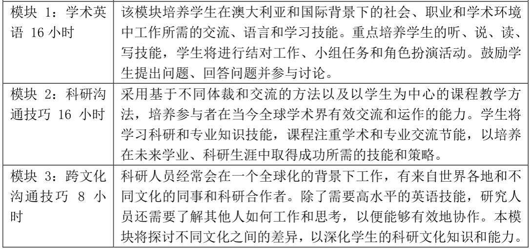 项目共2周,40个小时,旨在培养员工在澳大利亚和国际科研环境中所需的交流、语言和学习技能;