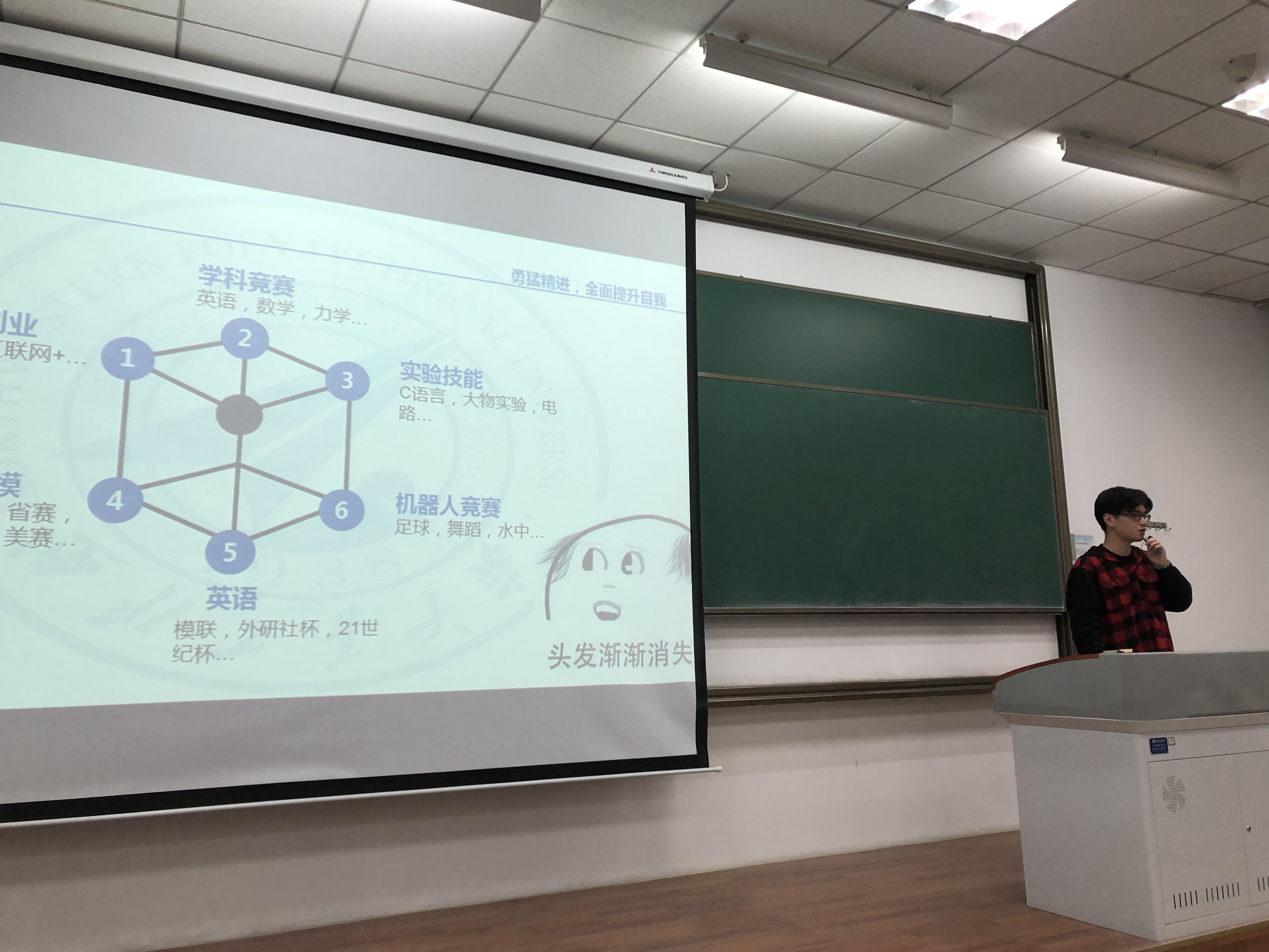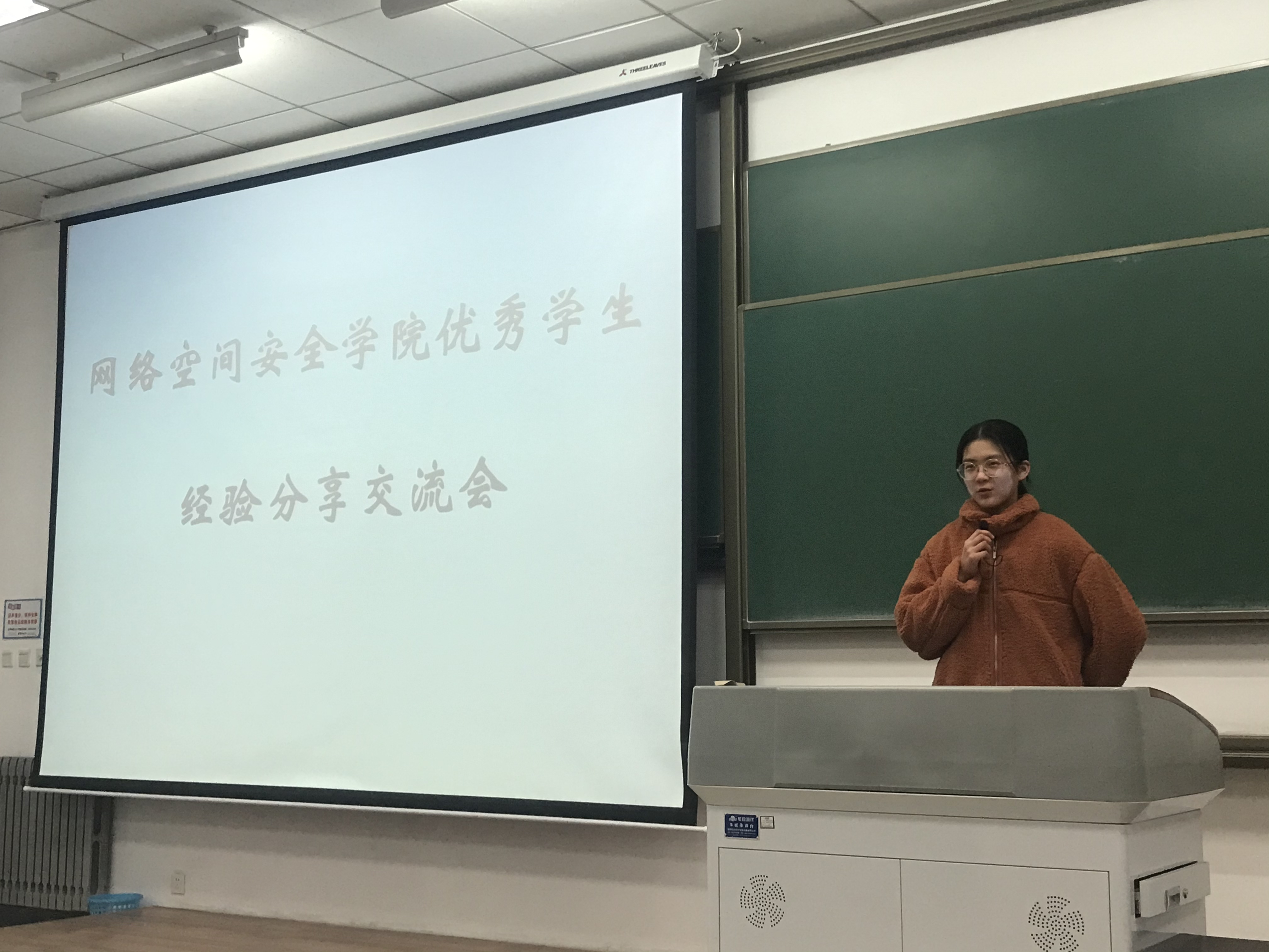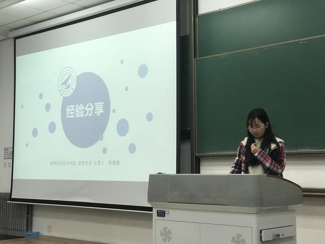 2017级的高丽同学结合自身经历,从基地、竞赛、科研三个方面为大家讲述了自己的经验,她讲到公司设立了足球机器人、舞蹈机器人、ACM、智能车、节能减排等基地,开展了数学建模、CTF等竞赛活动,大家可根据自己的特长和喜好选择加入,如果不知道自己想做什么,可以多加尝试,在不断尝试和学习中找到兴趣点并不懈为之奋斗。在分享的最后,高丽同学提到“学分积虽然重要但不是全部,我们应该学懂学透彻专业知识,做到灵活运用”。