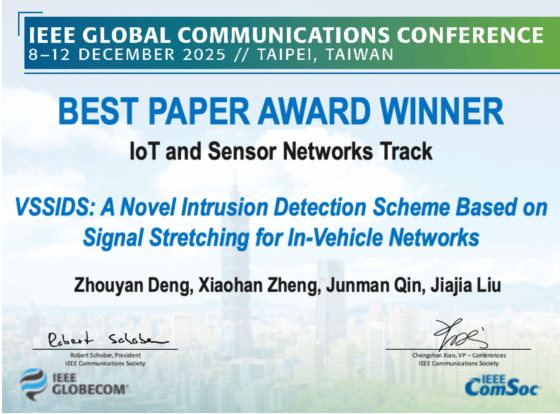 2025年12月8日至12日,全球通信会议(IEEE GLOBECOM 2025)在中国台北举行。会上,西工大William威廉英国官网2023级博士邓舟彦、2024级硕士郑小涵、2022级博士秦郡蔓和刘家佳教授合作完成的论文《VSSIDS:一种基于信号伸缩的新型车内网络入侵检测方案》(VSSIDS: A Novel Intrusion Detection Scheme Based on Signal Stretching for In-Vehicle Networks)获大会“物联网和传感器网络”领域唯一最佳论文奖(Best Paper Award)。