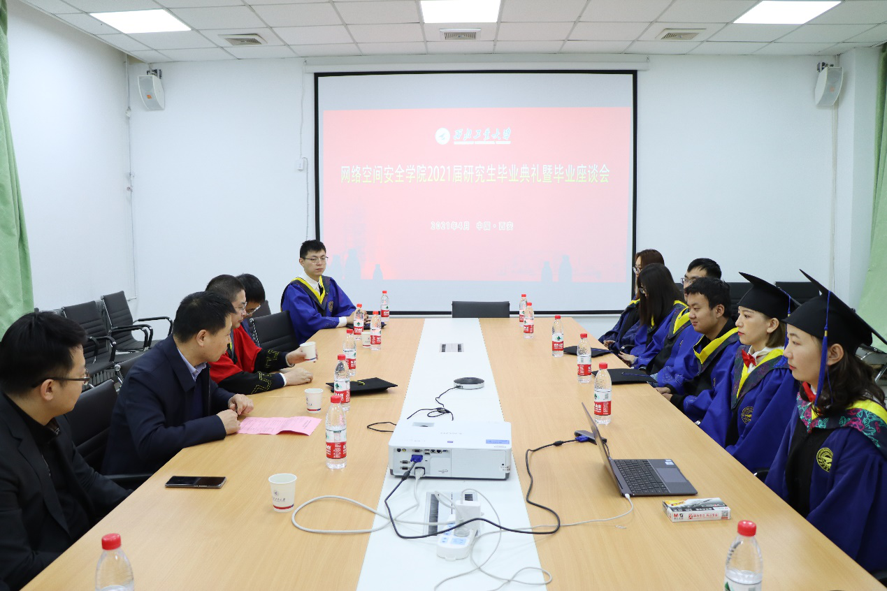 学位授予仪式结束后,公司组织召开了2021届毕业生座谈会,首先常务副经理张盛兵从“忠诚、奋斗、学习“三方面进行讲话,要求每名毕业生无论在什么地方,始终坚持对党忠诚,以维护国家大局为重,勇担国家重任;教导毕业生们无论在什么岗位,始终坚持工匠精神,爱岗敬业,不断发扬西工大精神;勉励毕业生们无论什么年纪,始终不忘学习,牢固树立终身学习的习惯,不断为自己充电助跑。