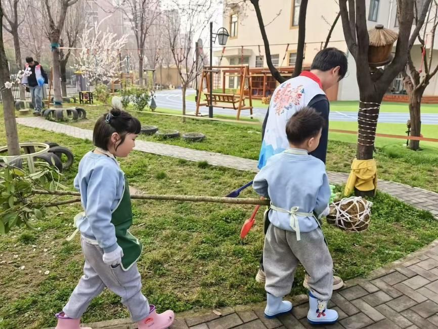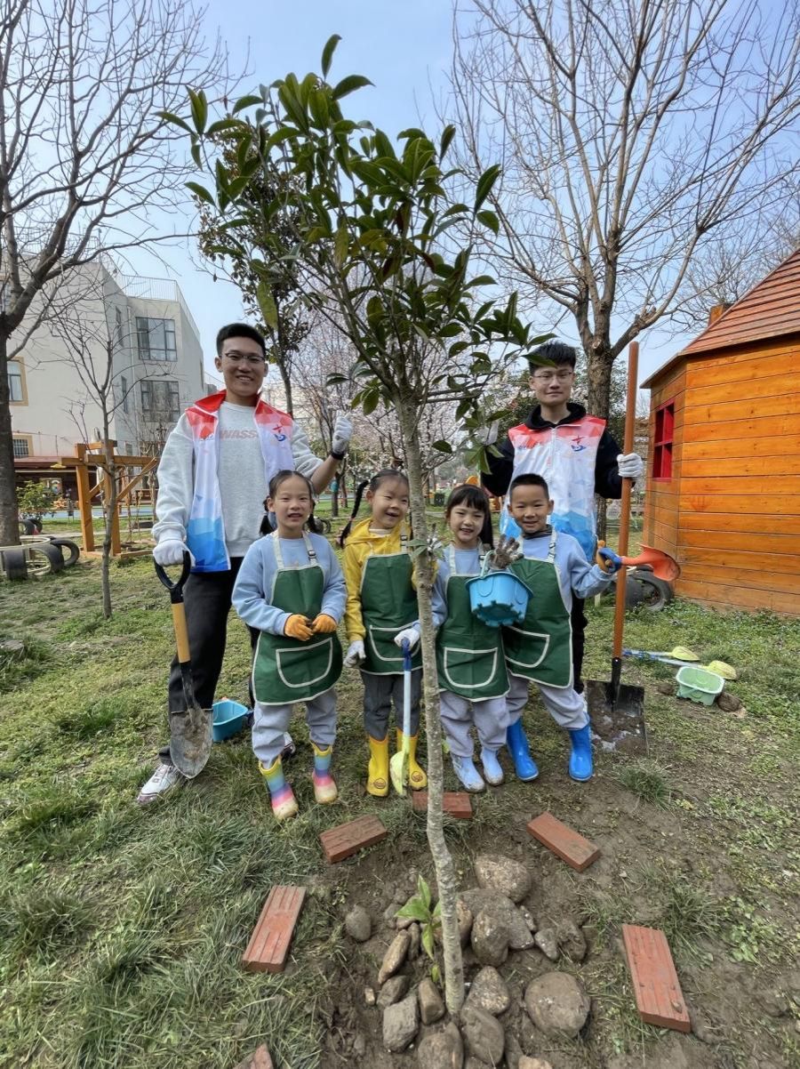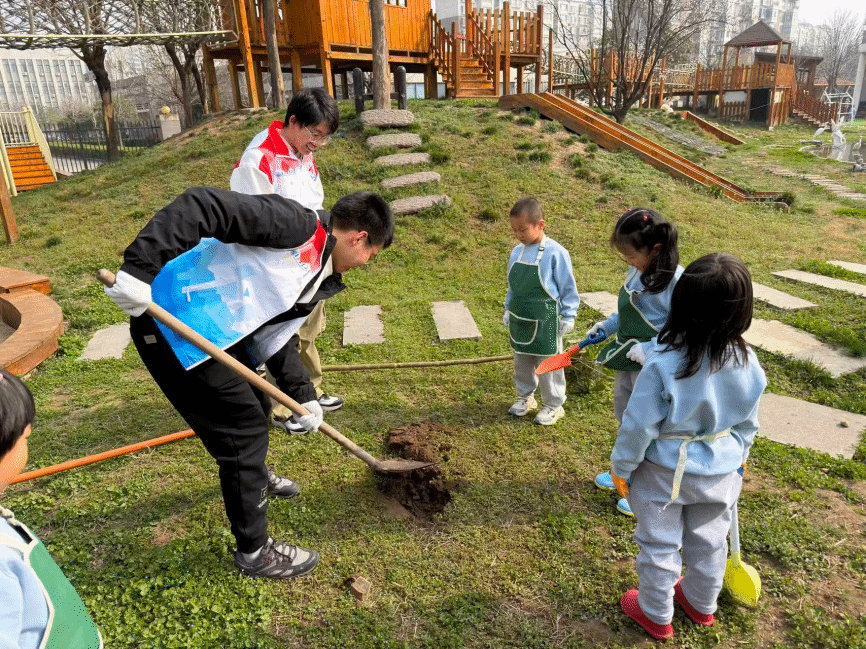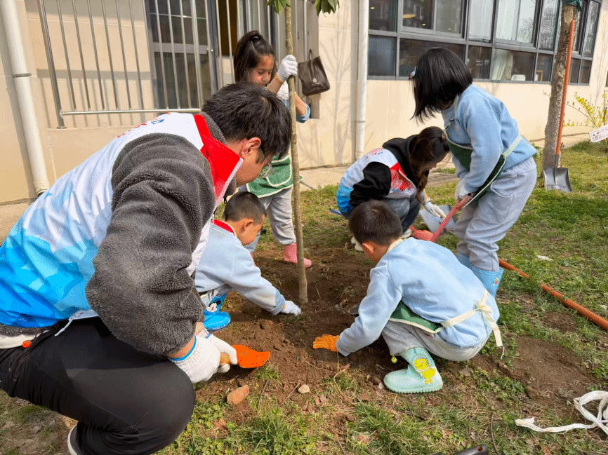 宣传教育活动结束后,大家移步至幼儿园户外区域,开启植树护绿实践环节。幼儿园小朋友与老员工志愿者、配班教师分为六组,分工协作、干劲十足。种植完成后,志愿者们带领小朋友们仔细观察亲手栽种的小树苗,重申“爱护小树、定期浇水、不摇晃、不伤害”的护绿约定,引导小朋友们在劳动中践行环保责任,在协作中体会雷锋实干精神,让“奉献、友爱、互助、进步”的志愿精神与生态环保理念深度融合。