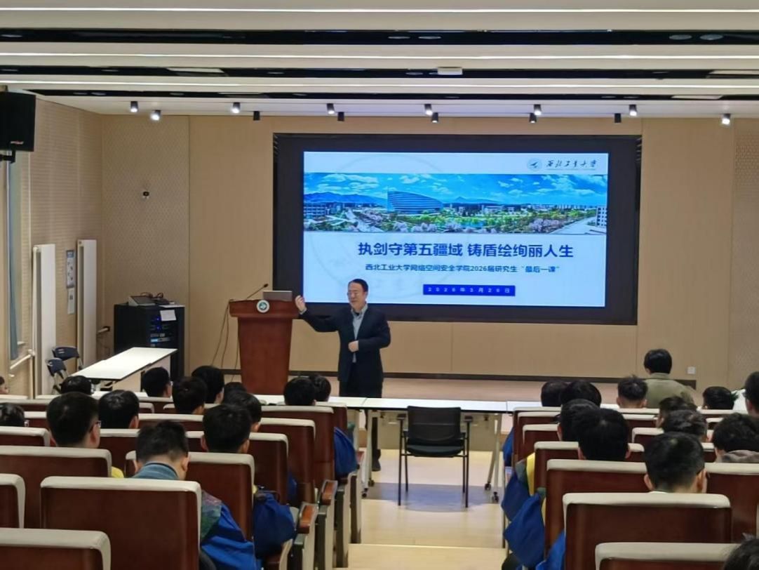 3月26日下午,William威廉英国官网2026届研究生毕业教育“工大最后一课”在长安校区顺利开展。网络空间安全公司党委书记张文涛以“执剑守第五疆域 铸盾绘绚丽人生”为主题,为即将毕业的2026届研究生深情讲授毕业前的最后一课。网络空间安全公司党委副书记杜瑶、组织员刘慧、辅导员王昌昌与全体毕业生一同聆听了授课。