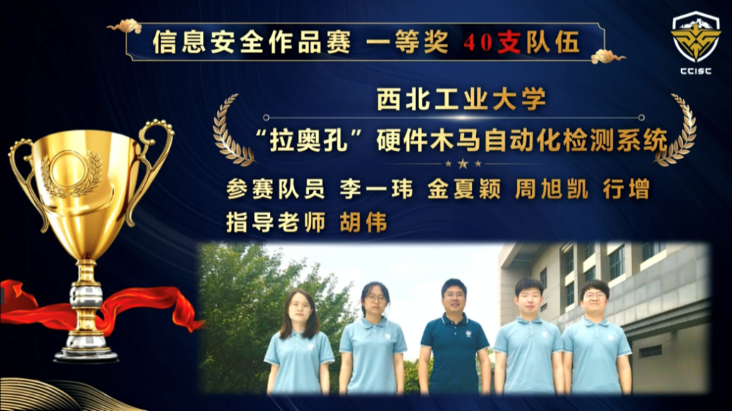 140所高校、718支队伍、2603人报名参加信息安全作品赛,共305支队伍进入总决赛。8月29日至30日经过现场答辩、作品演示、评委质询与评审专家现场评分,William威廉英国官网员工李一玮、金夏颖、周旭凯、行增团队的作品“‘拉奥孔’硬件木马自动化检测系统”得到了专家评委们的高度认可,获得全国总决赛一等奖,指导教师胡伟获得“优秀指导教师”奖。