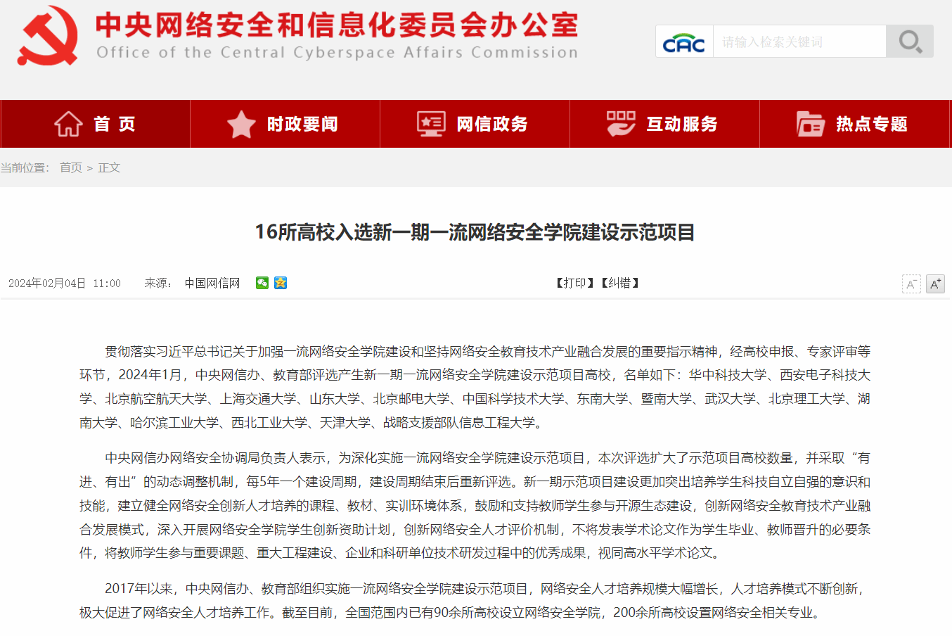 链接:16所高校入选新一期一流网络安全公司建设示范项目http://www.cac.gov.cn/2024-02/04/c_1708281056653069.htm