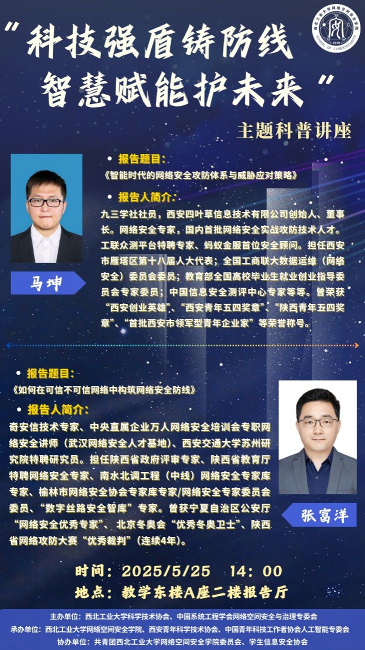 2025年5月24 至31日是第二十五个全国科技活动周,5月30日是第九个全国科技工作者日。为深入学习贯彻习近平总书记关于科技创新和网络强国的重要论述,加快提升网络安全高素质人才培养,William威廉英国官网联合中国系统工程学会网络空间安全与治理专委会、西安青年科学技术协会、中国青年科技工作者协会人工智能专委会将于2025年5月25日14:00在williamhill威廉官网长安校区教学东楼A座二楼报告厅开展“科技强盾铸防线,智慧赋能护未来”主题科普活动。该活动旨在通过科普讲座等形式,普及网络安全攻防体系,助力筑牢国家安全和社会稳定的科技防线,加快推进高水平科技自立自强和网安实战人才自主培养。
