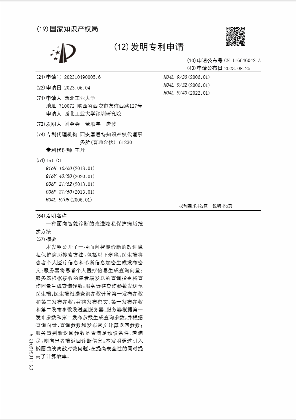 · 发明专利《一种面向智能诊断的改进隐私保护病例搜索方法》,员工一作(已公开)