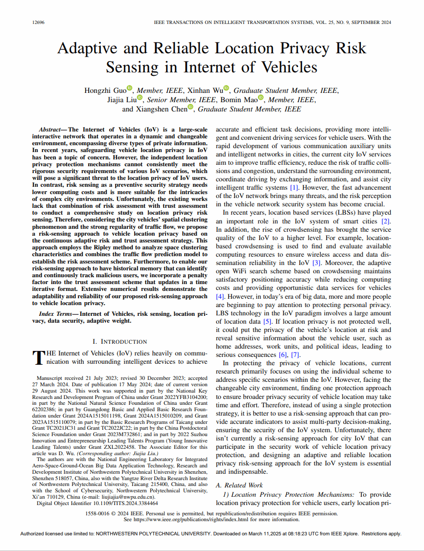 2.《Adaptive and Reliable Location Privacy Risk Sensing in Internet of Vehicles》,员工一作,发表于IEEE Transactions on Intelligent Transportation Systems (SCI, 中科院I区, IF: 7.9)