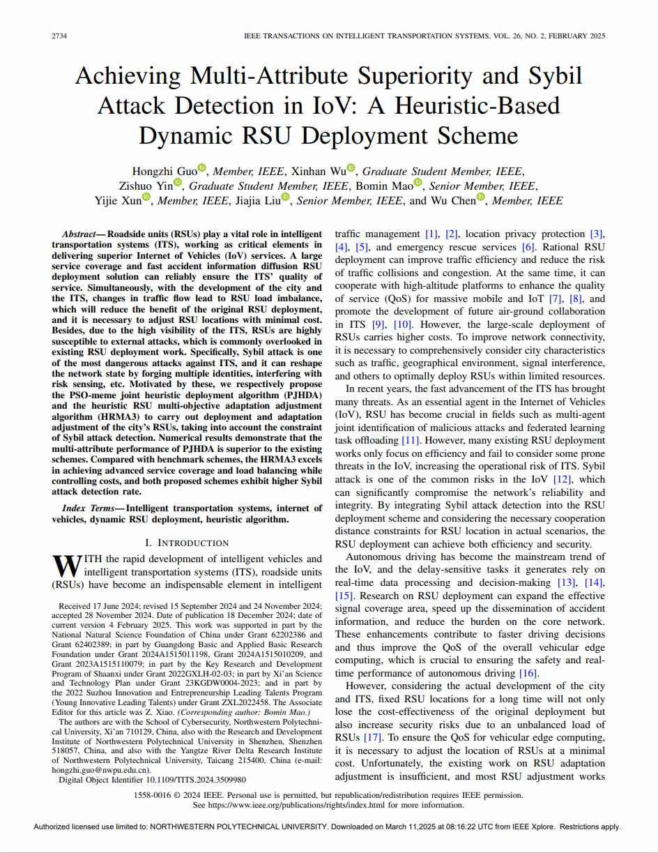 1.《Achieving Multi-Attribute Superiority and Sybil Attack Detection in IoV: A Heuristic-Based Dynamic RSU Deployment Scheme》,员工一作,发表于IEEE Transactions on Intelligent Transportation Systems (SCI, 中科院I区, IF: 7.9)