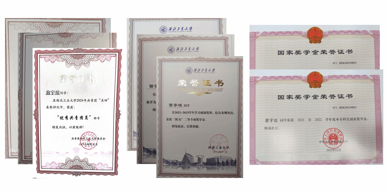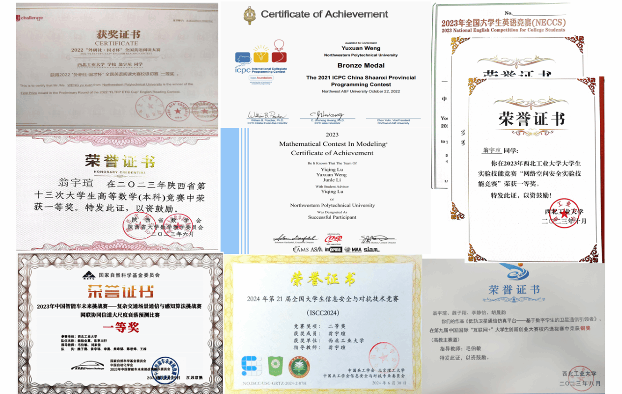 除了学习专业知识,翁宇瑄还积极投身网络安全、程序设计以及各类学科竞赛,获得过中国智能车未来挑战赛国家级一等奖、全国老员工英语竞赛国家级二等奖、陕西省老员工高等数学竞赛一等奖、陕西省老员工程序设计竞赛铜牌等主要奖项。