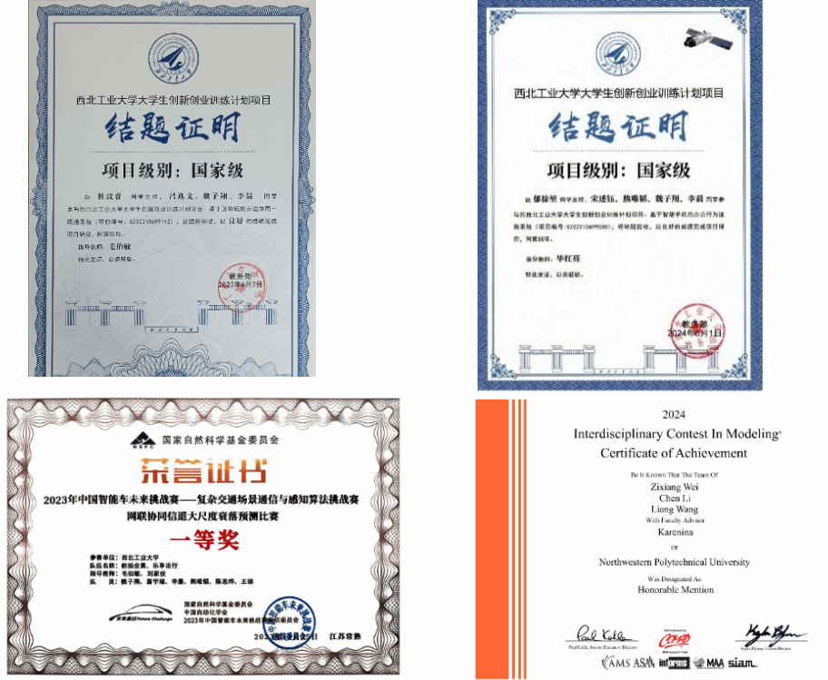 除了在科研与论文方面取得突出成果外,魏子翔同学在本科阶段还积极参加各类学科竞赛,展现出较强的综合实践能力与团队协作精神。2022年-2024年间,参加了两项国家级老员工创新创业项目,均获得良好结题。2023年,作为团队队长参与中国智能车未来挑战赛并获得全国一等奖;
