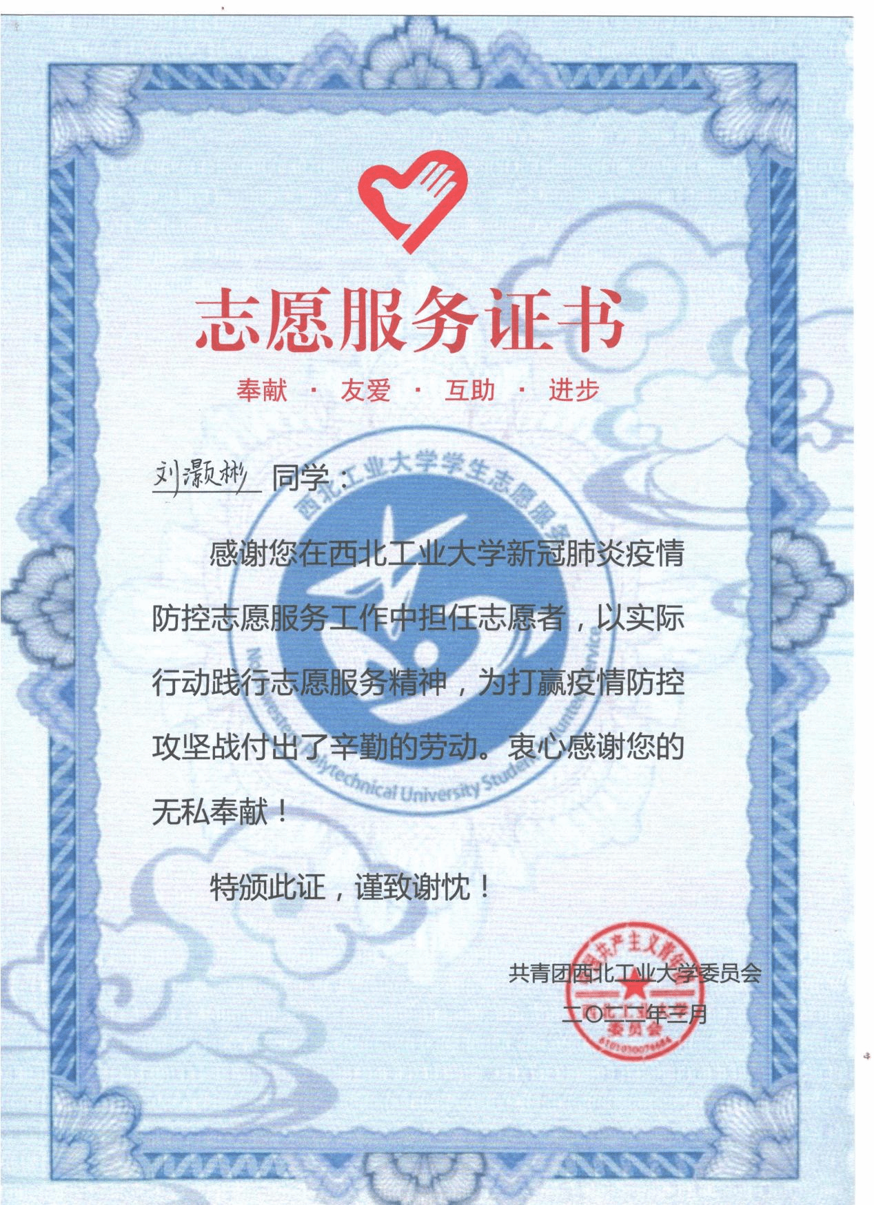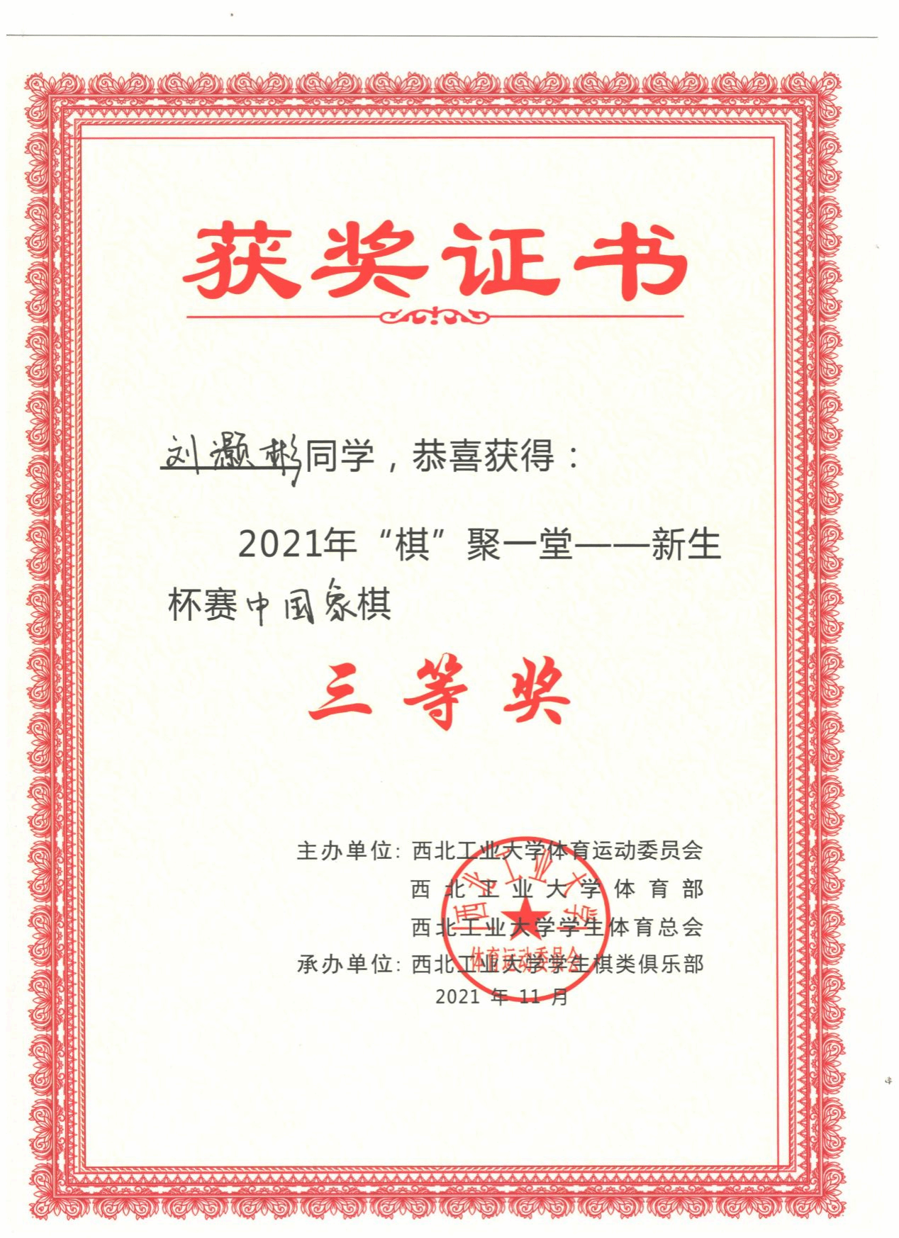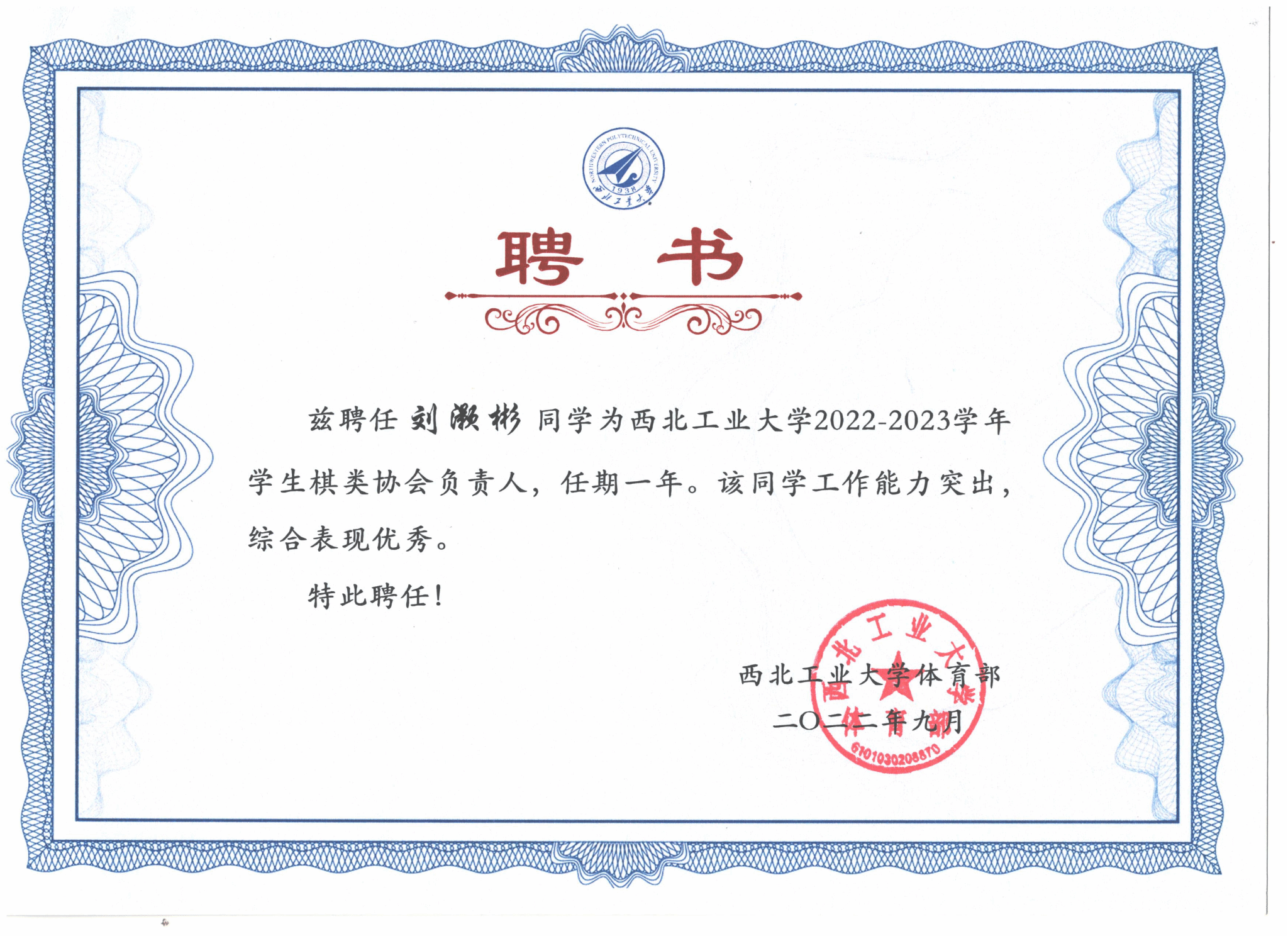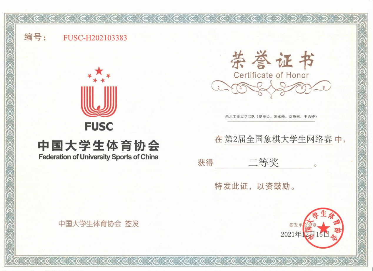 除学习之外还参与乒乓球、棋类、拔河等多项体育项目,获第二届全国老员工象棋锦标赛二等奖、陕西省老员工棋类交流赛三等奖等。积极参与社会实践,参与2023暑期广州社会实践,参与疫情防控、“灿烂千阳”线上支教、“安守四方”反诈公开课等实践活动累计志愿时长超200小时。