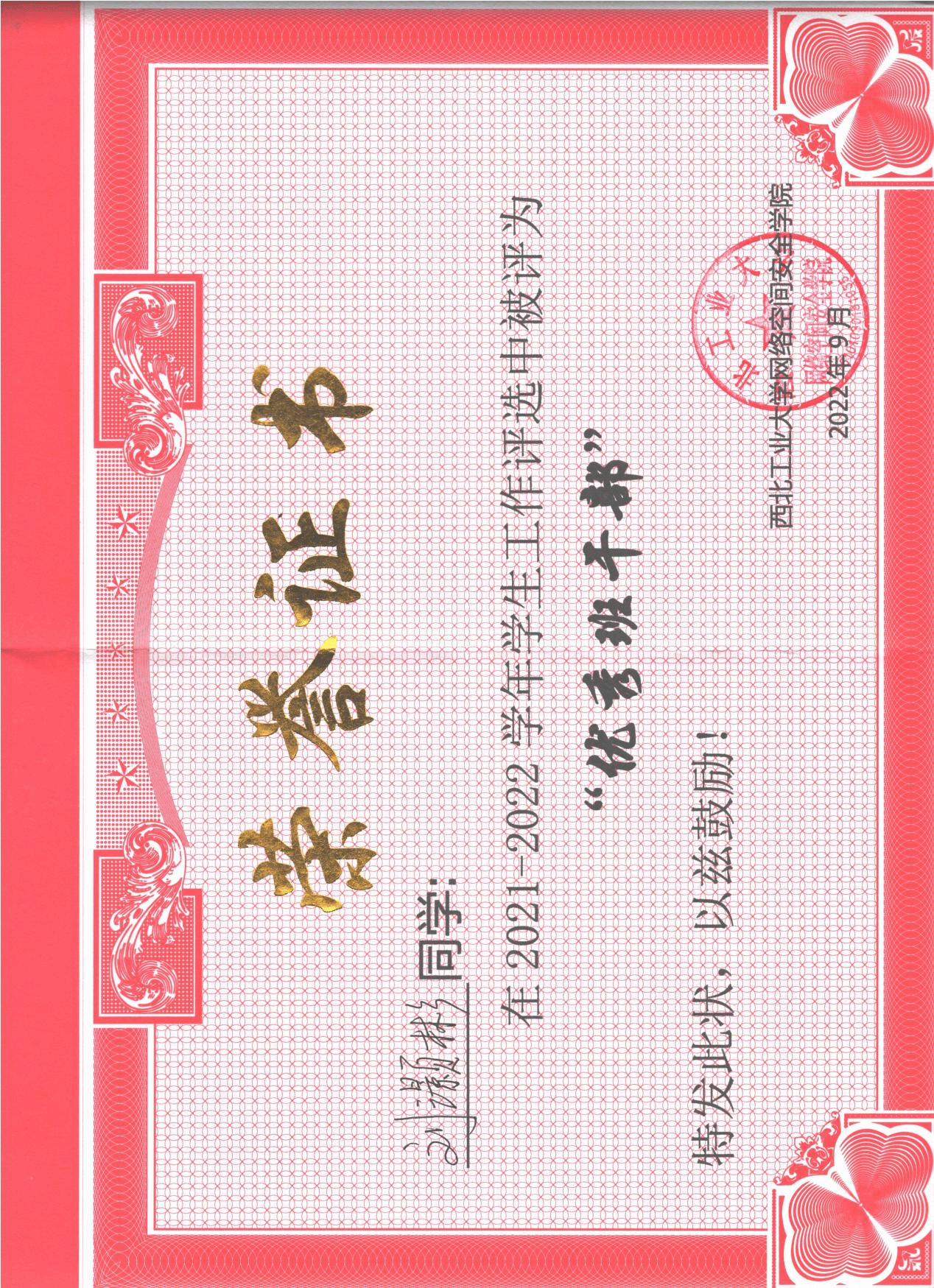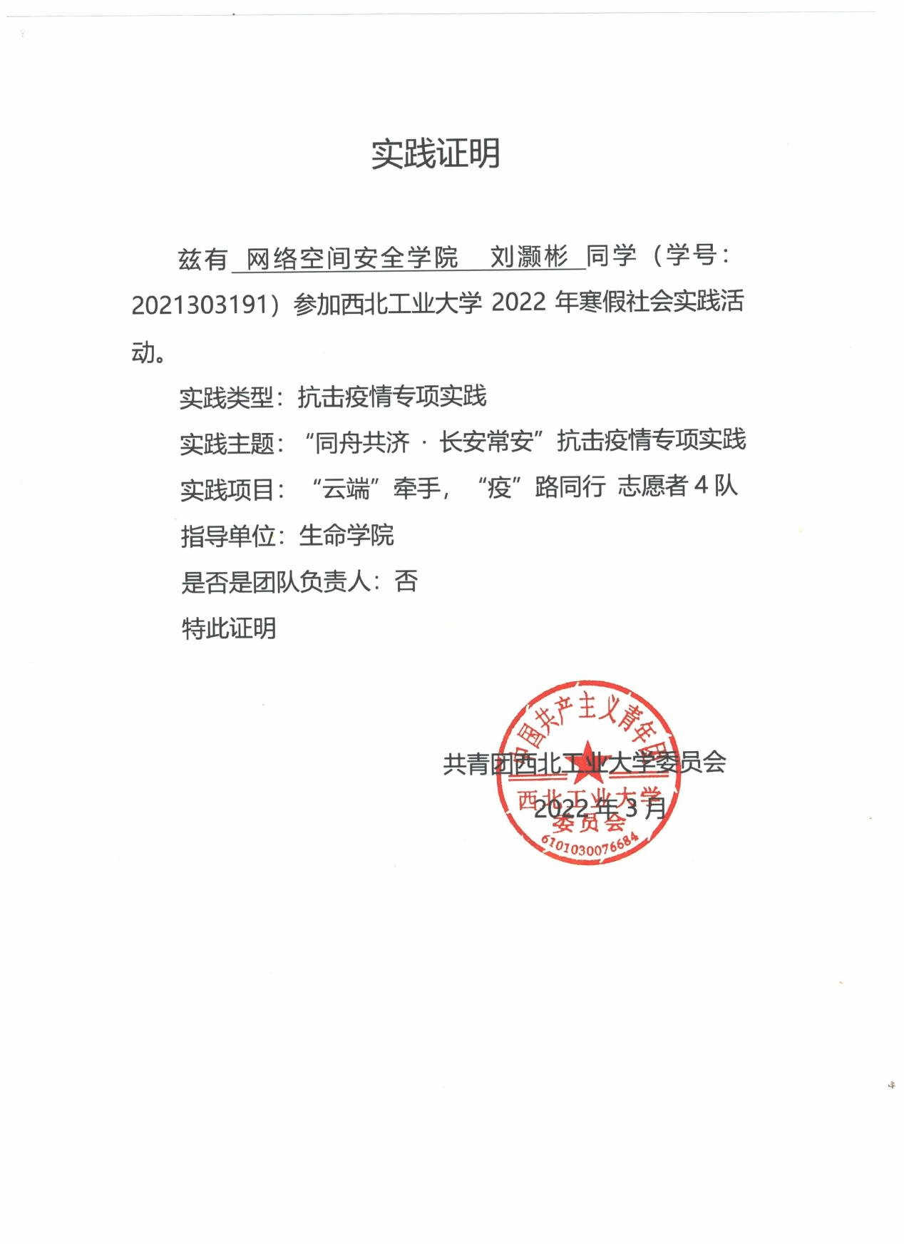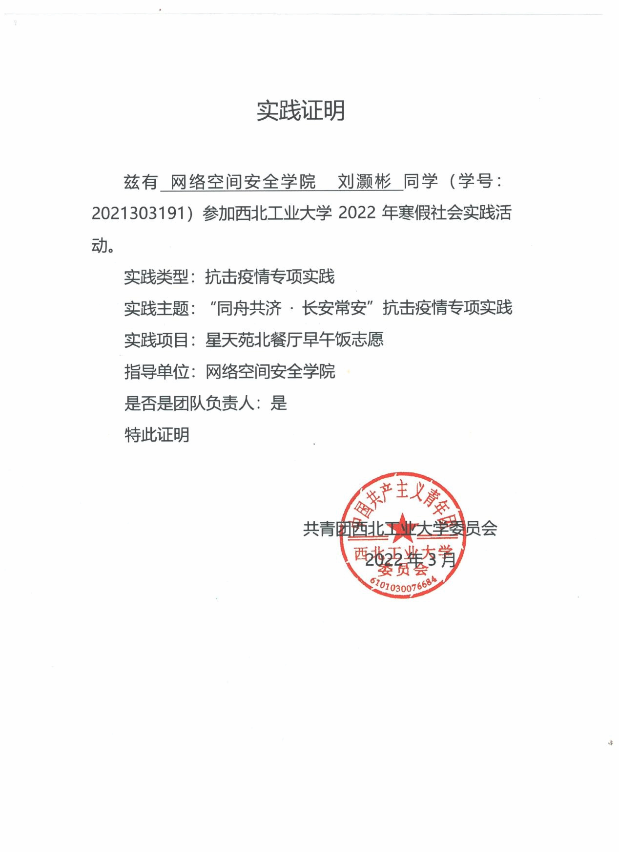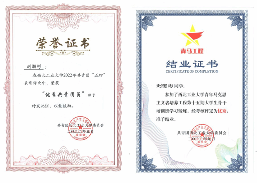 理想信念坚定,积极向党组织靠拢。自大一入学提交入党申请书以来,不断接受党的教育,于2024年成为了一名光荣的共产党员。积极参与思政教育活动与社会实践,参与如五四青年说、我学我讲二十大等思政活动,并前往革命圣地延安参观学习。在第十五期“青年马克思主义者培养工程”老员工骨干培训班中评为“优秀学员”。在2022、2023、2024年五四表彰中连续三年被评为“优秀共青团员”。