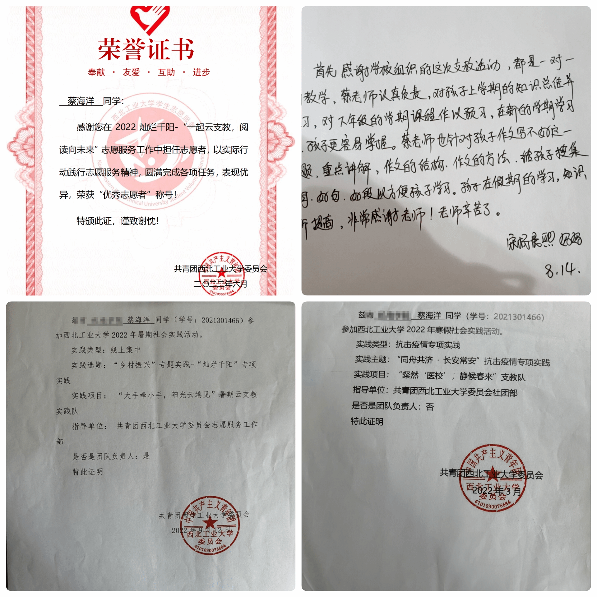 蔡海洋在学习之余,也积极参与各类活动。在疫情期间多次担任志愿者,为抗击疫情做贡献,志愿时长累计237小时;多次参与校团委举办的云支教社会实践,获“优秀志愿者”称号以及来自家长的感谢信。多次参加校园获得,提高自身的素养。