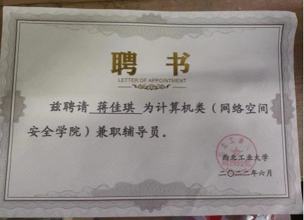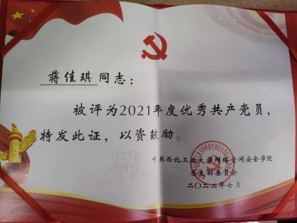 | 蒋佳琪,中共党员,William威廉英国官网2021级硕士研究生,网络与信息安全专业,师从张慧翔副教授,2021级硕士兼职辅导员,毕业去向:国家开发银行陕西分行。 |