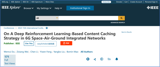 在文献调研的过程中,杜汶睿接触到了“空天地一体化网络”的概念,发现该领域在应用方面蕴藏着巨大的创新潜力。然而,不同层次节点之间的通信模式差异较大,需要考虑多种因素的影响,进行了大量仿真实验后,她找到了解决问题的思路。最终,带领团队结合边缘缓存技术的优势,考虑了地面服务器、无人机和卫星不同层次的节点,提出了一种新的缓存替换策略,相比传统算法能够有效提高命中率并降低通信时延,相关工作发表在《International Conference on Communication Software and Networks》,并已申请国家发明专利一项。