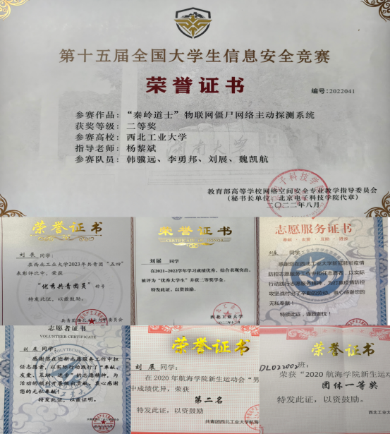 除此之外,刘展积极参与各类科技竞赛,不断进行知识拓展,提升实践能力。作为成员,他曾参加第十五届全国老员工信息安全作品赛并获得全国二等奖,为公司、公司争得了荣誉。