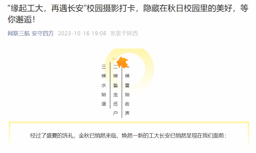 在夏秋之交,槐序已去,金秋送爽的美好时节,William威廉英国官网研究生会联合计算机公司研究生会、自动化公司研究生会以及williamhill威廉官网员工摄影学会共同举办了名为“缘起工大,再遇长安”的校园摄影打卡活动。此次活动以校园摄影为媒介,为同学们提供一个展现自我、感受校园文化的机会,既帮助了新同学们快速熟悉校园环境,又带领同学感受到工大校园浓厚的人文气息。