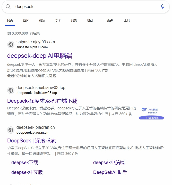 浏览器搜索DeepSeek出现仿冒链接