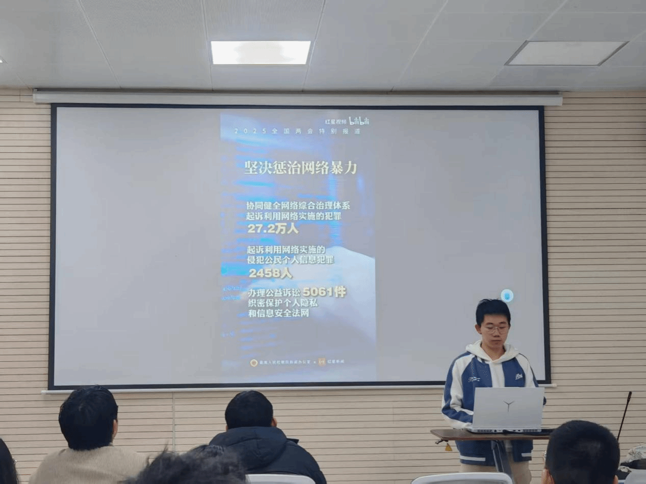 紧接着,主持人丁晟同学带领全体成员学习2025全国两会相关内容。丁晟精心准备了两会词语解读和习近平总书记重要讲话的视频资料,与同学们一同观看学习。在观看过程中,大家认真聆听习近平总书记重要讲话,领会两会传递的精神内涵。通过学习两会精神,同学们更加明确了自己作为新时代青年的责任与使命,要在学习和生活中不断提升自己,为社会发展贡献力量。