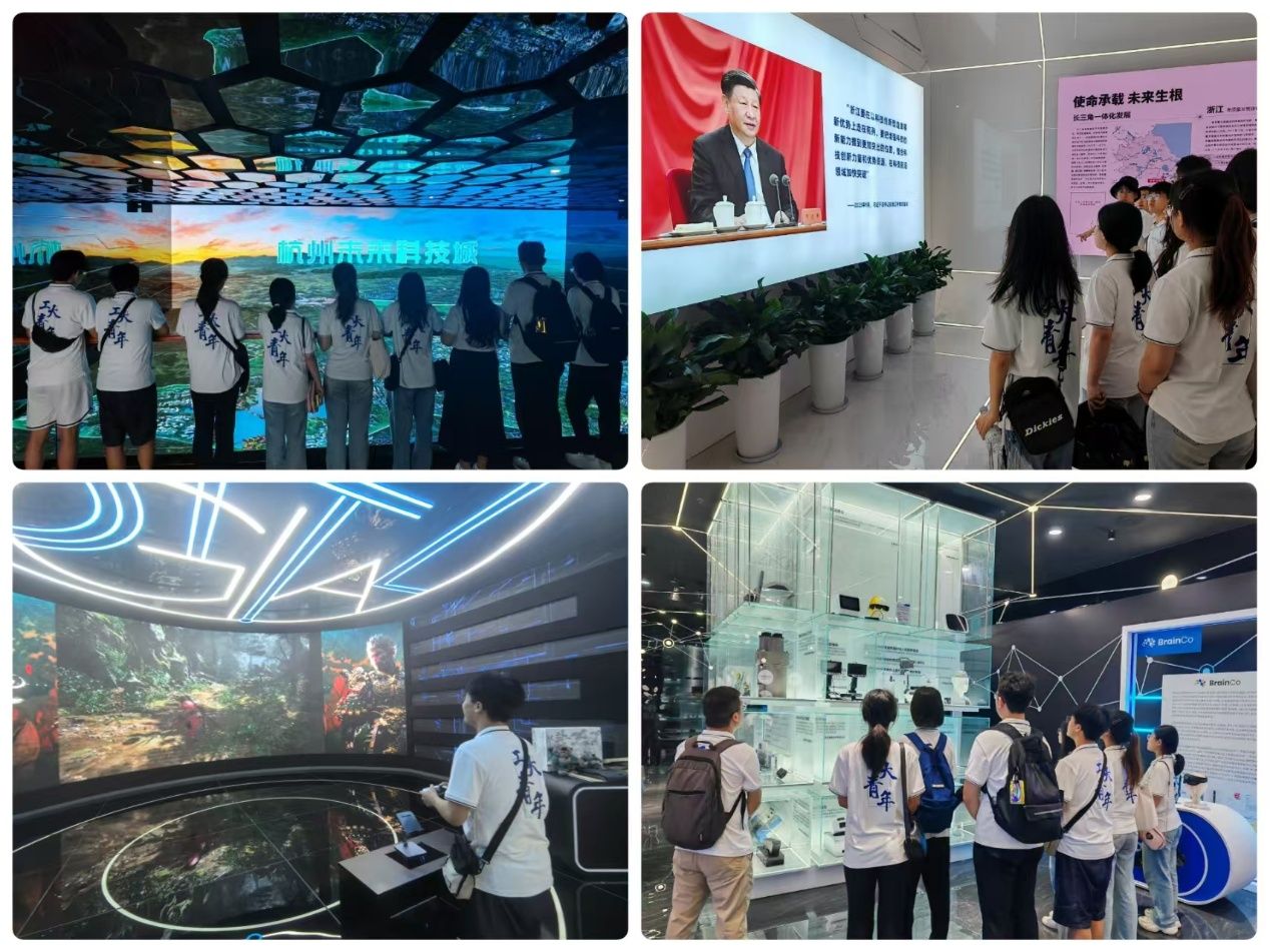 同时,实践团队共赴杭州未来科技城展馆,深度体验前沿科技。在杭州“六小龙”专题展区,实践队成员深入了解了深度求索、强脑科技等杭州“六小龙”企业的前沿技术与创新成果。展区通过传统展示方式与互动体验相结合,向大家生动呈现了人工智能、智能制造、生物医药等领域的前沿应用。同学们与DeepSeek互动、现场体验国产游戏《黑神话·悟空》并近距离接触新兴产品,切身感受科技创新与技术落地带来的震撼与魅力。