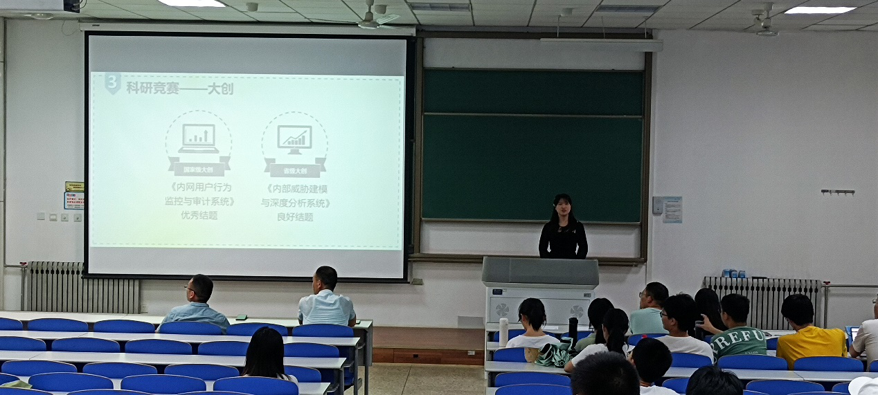 然后是王偲怡学姐进行她的分享。她通过风趣幽默的语言,讲述了自己本科期间的经历,分享了网安大家庭对员工的关怀,介绍了申请国外大学offer的经验,展示了网安优秀学子乐观、向上的风貌和对个人发展的规划思考。