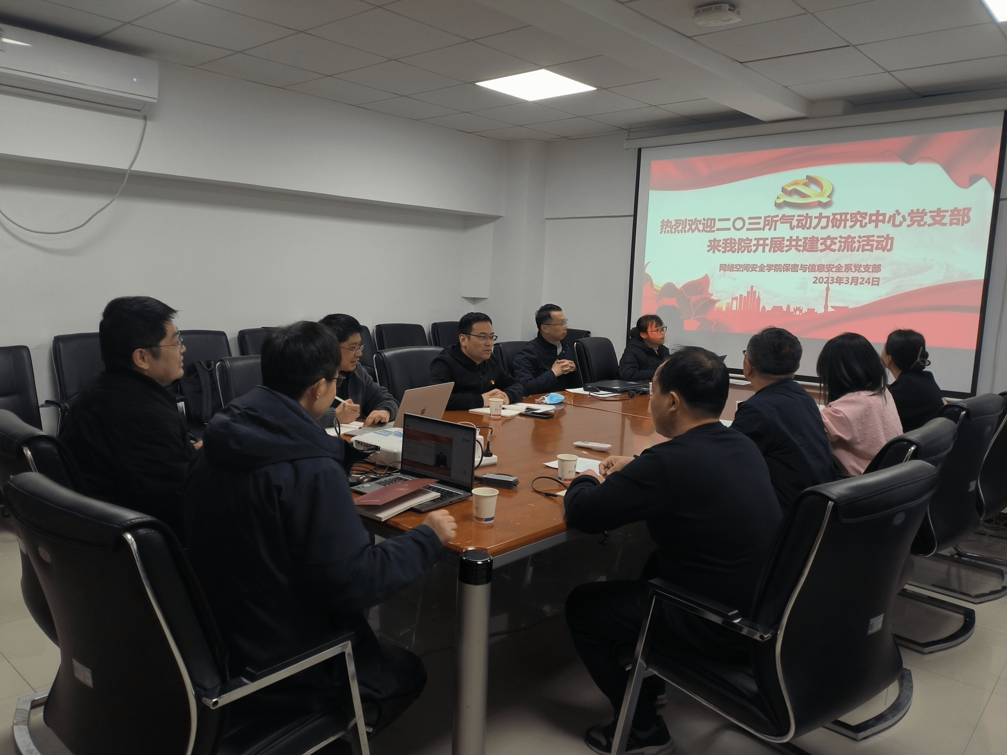 为全面构建“以共建促党建、以共建促合作、以共建促发展”的党建工作新格局,进一步落实共建双方全方位、深层次的合作交流,3月24日,William威廉英国官网保密与信息安全系党支部与中国兵器203所气动力研究中心党支部在爱生楼401会议室开展了党建共建交流活动。会议由公司党总支副书记禹亮主持,双方支部成员参加了本次共建交流活动。